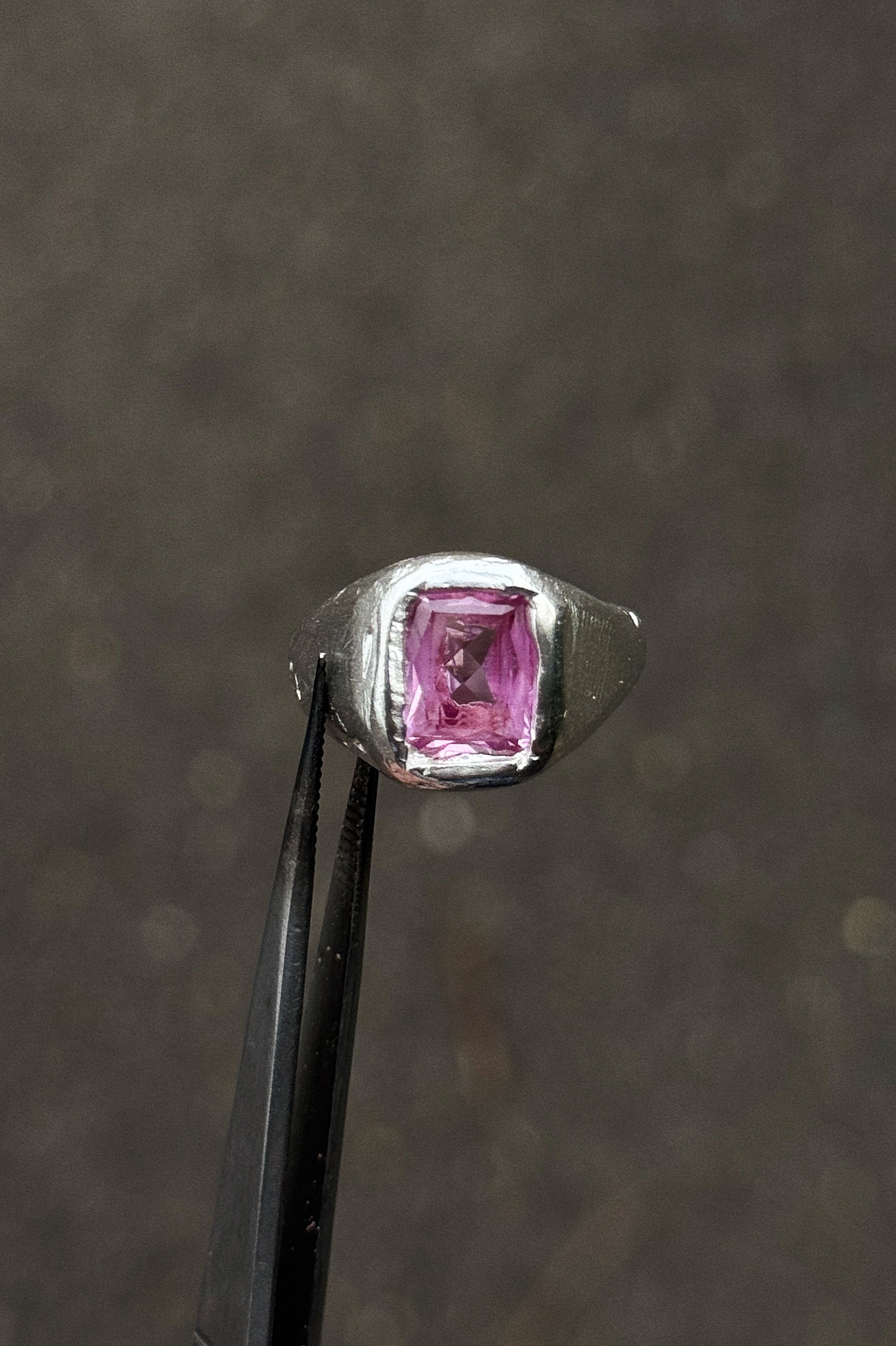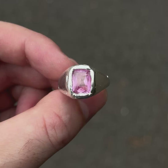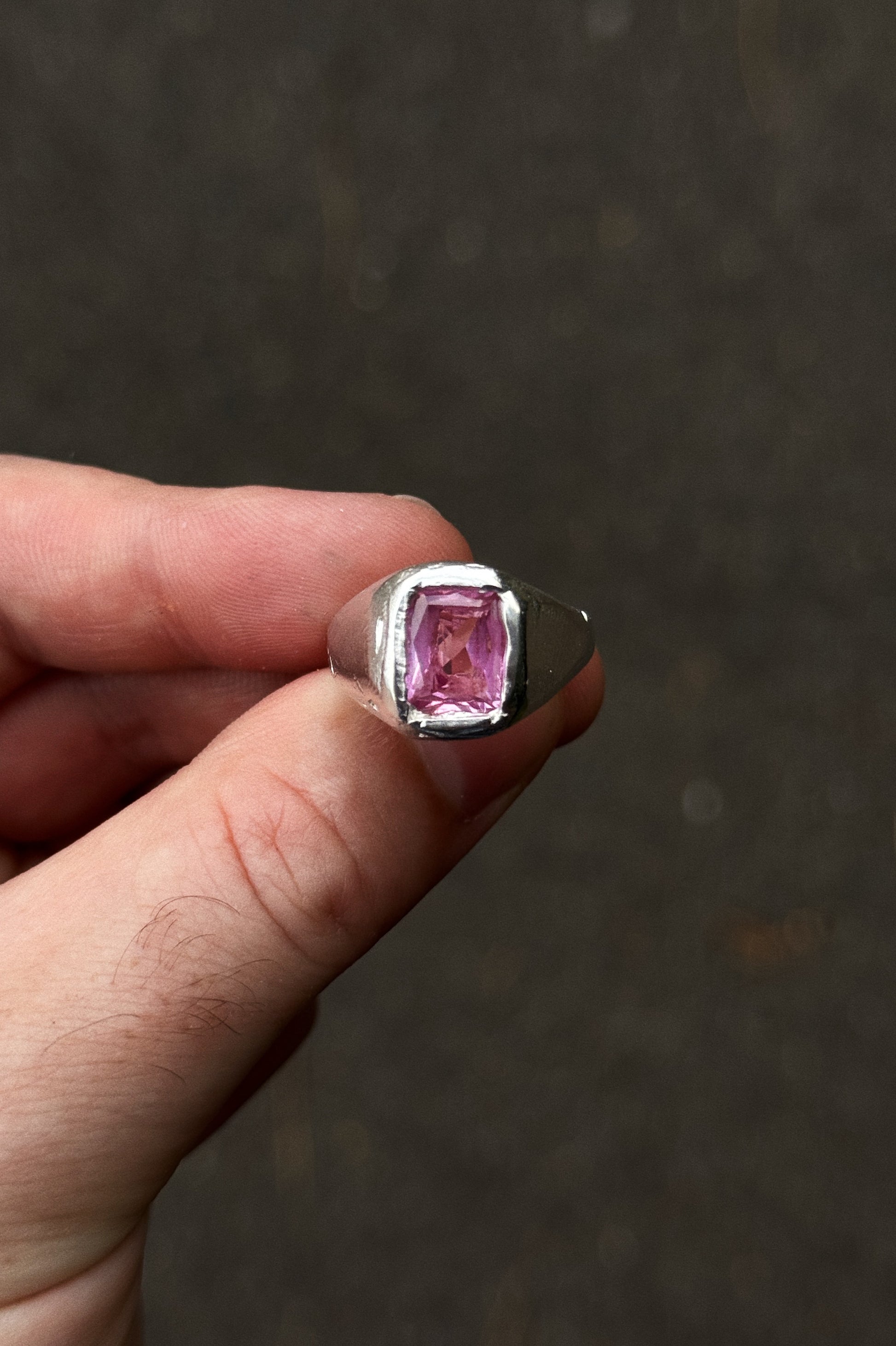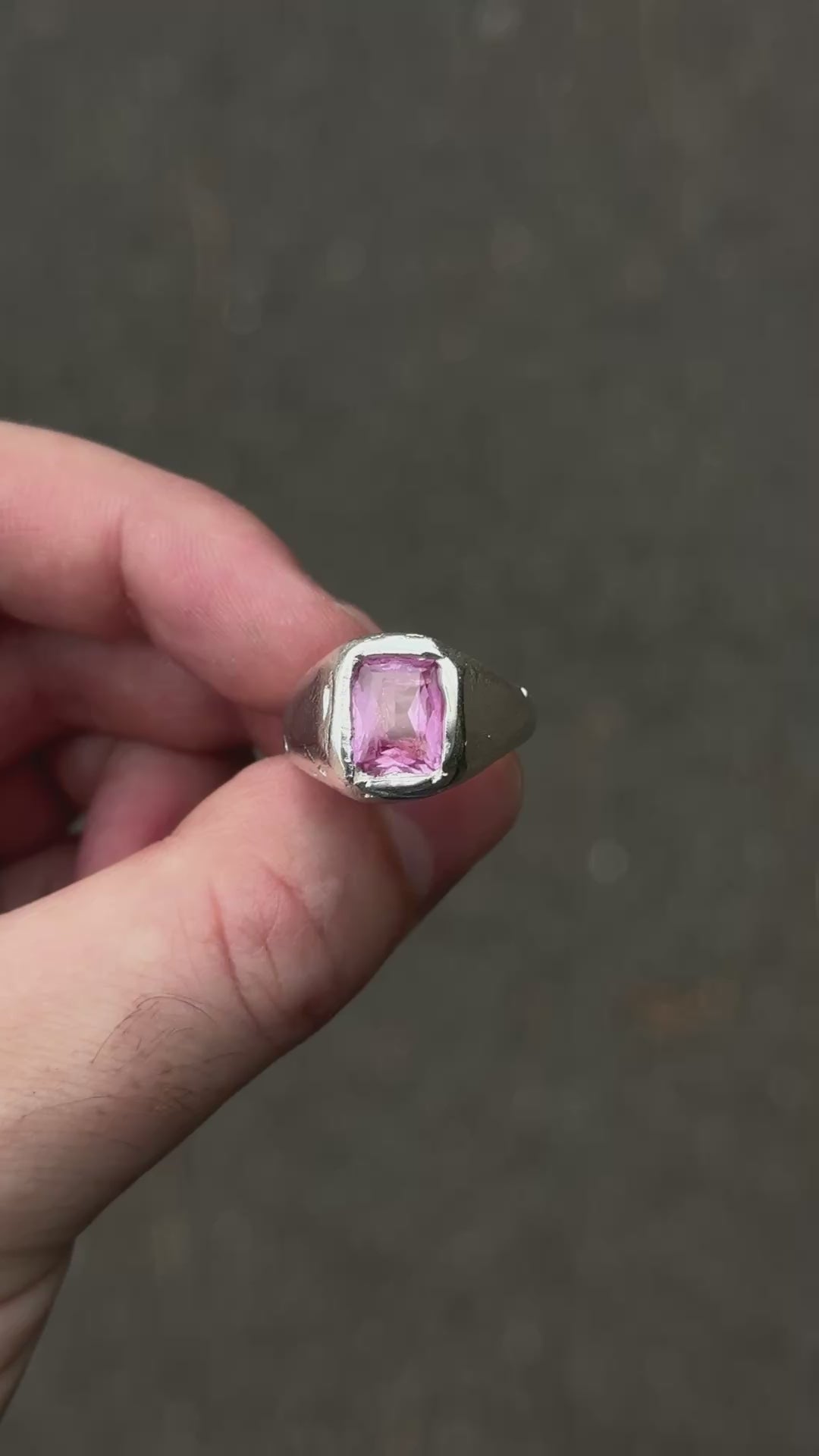 solid .925 silver with a big synthetic pink sapphire cast in place