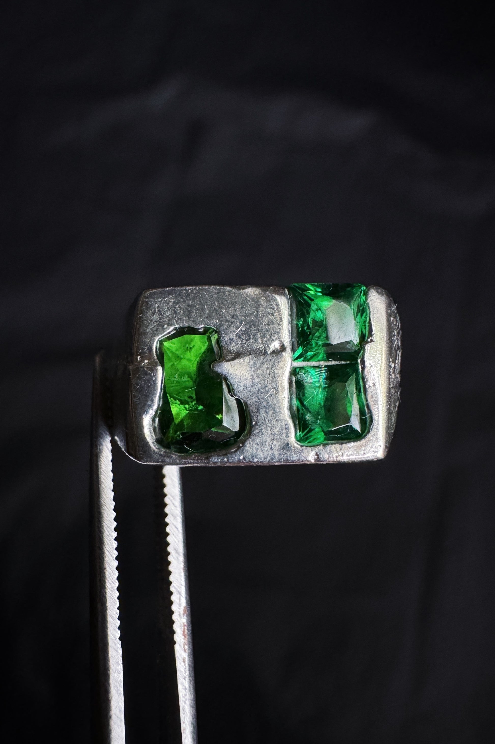 solid .925 silver with three green nano stones cast in place