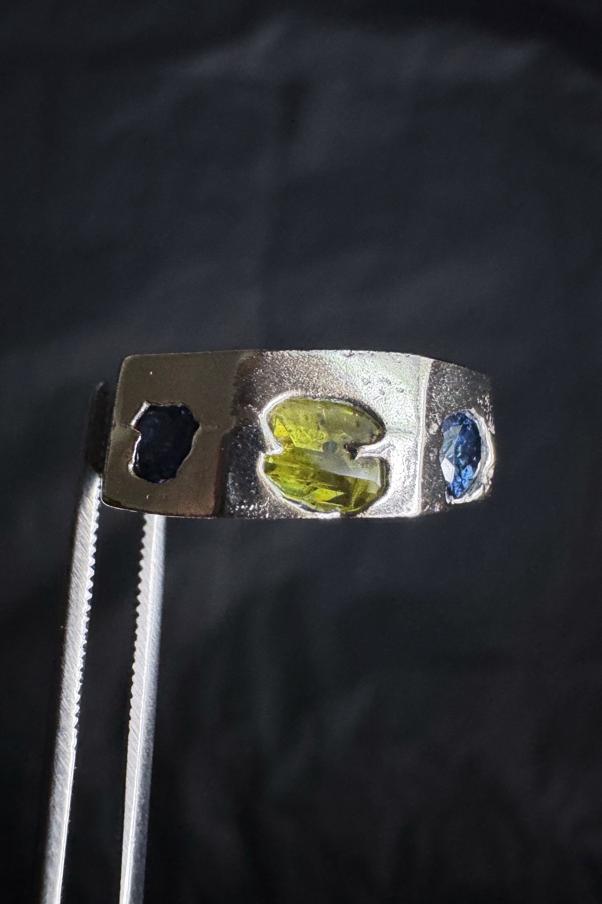 molten silver is poured into a sand mold, the stones are placed before pouring the metal allowing them to move around in the liquid silver before it hardens again. each ring is completely unique and unable to be replicated, this is why each piece looks slightly different :-)