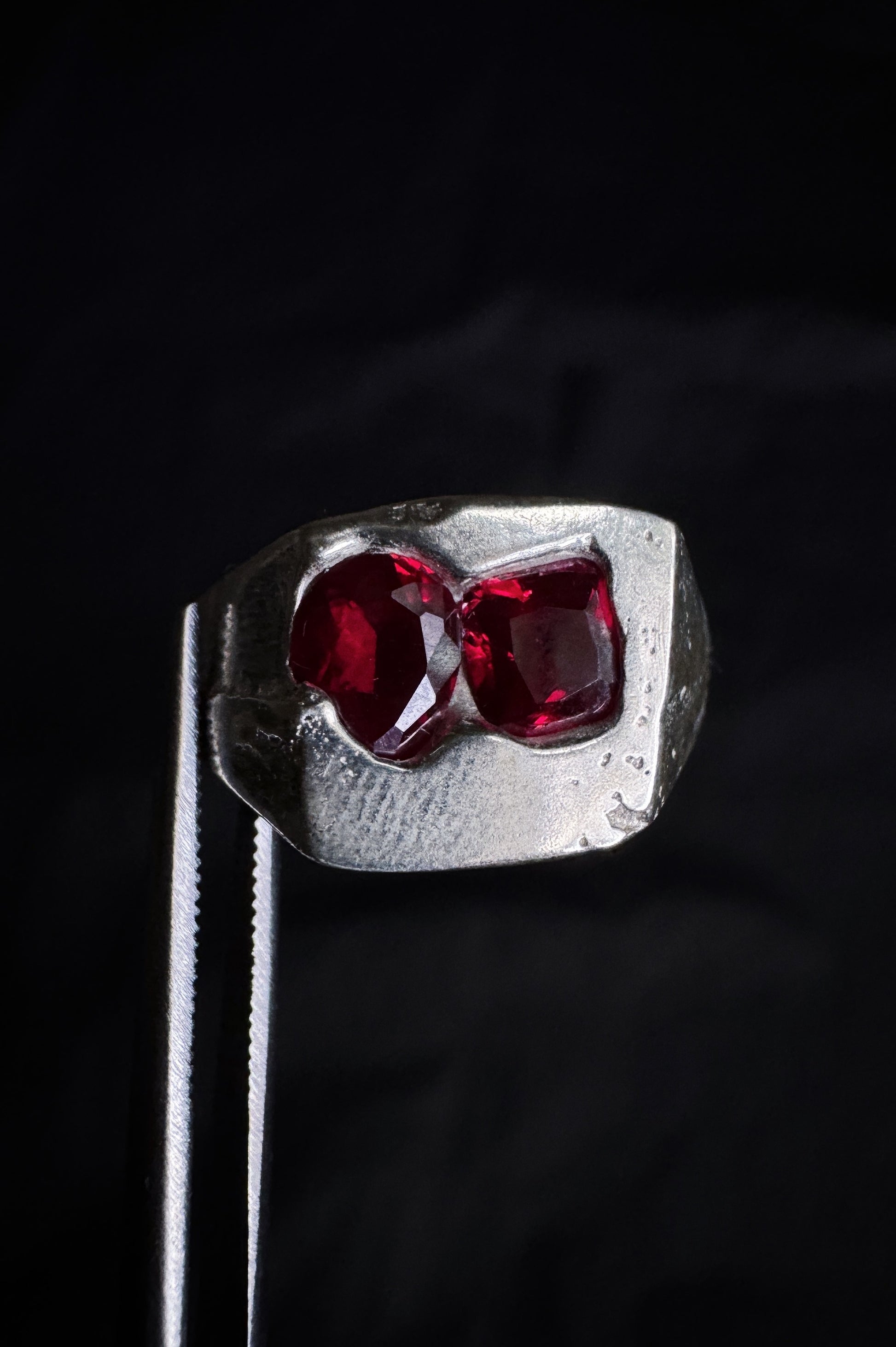 molten silver is poured into a sand mold, the stones are placed before pouring the metal allowing them to move around in the liquid silver before it hardens again. each ring is completely unique and unable to be replicated, this is why each piece looks slightly different :-)