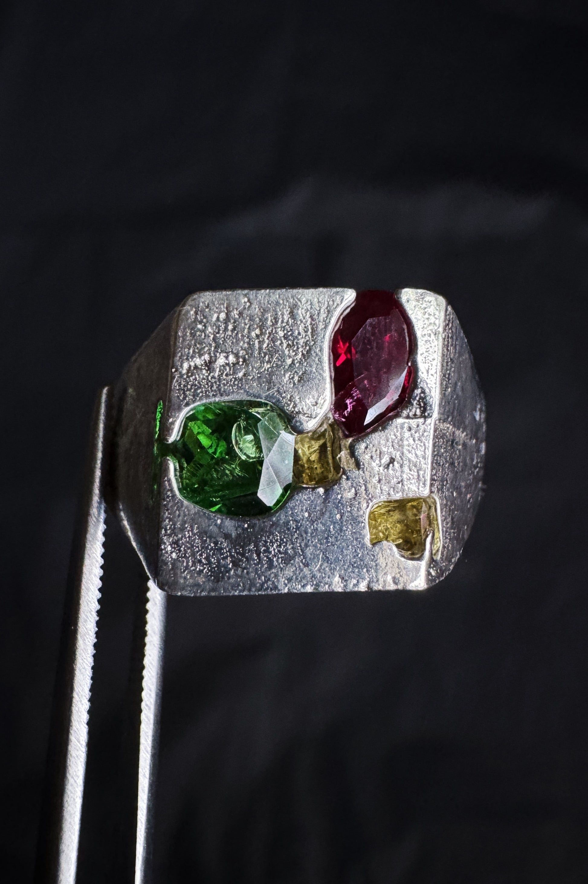 solid .925 with a green nano, synthetic ruby, and synthetic yellow sapphire cast in place