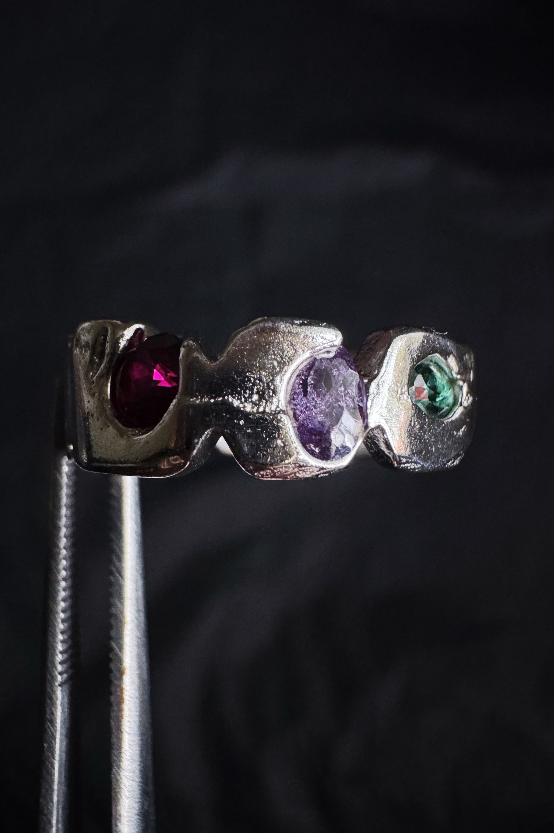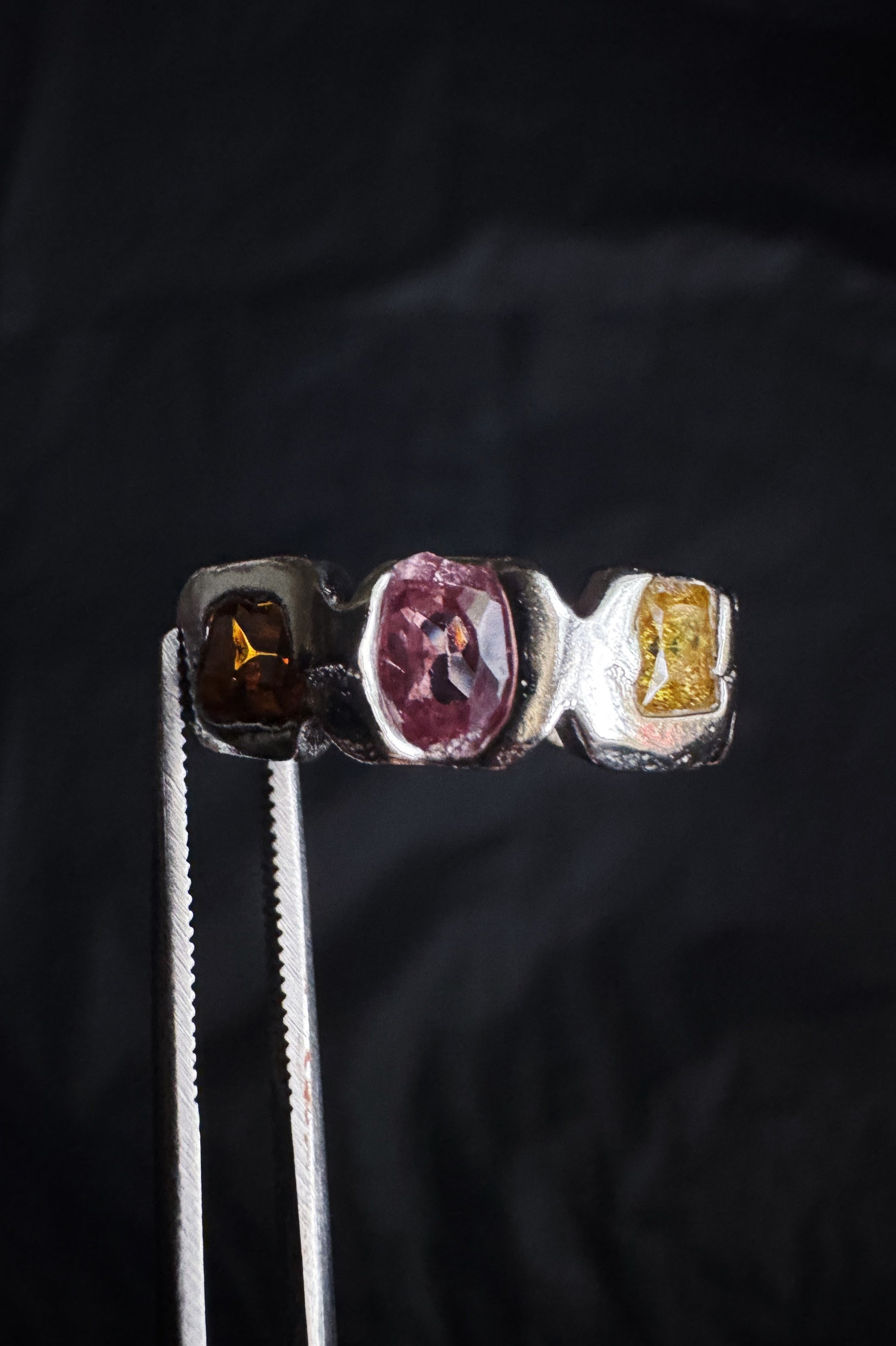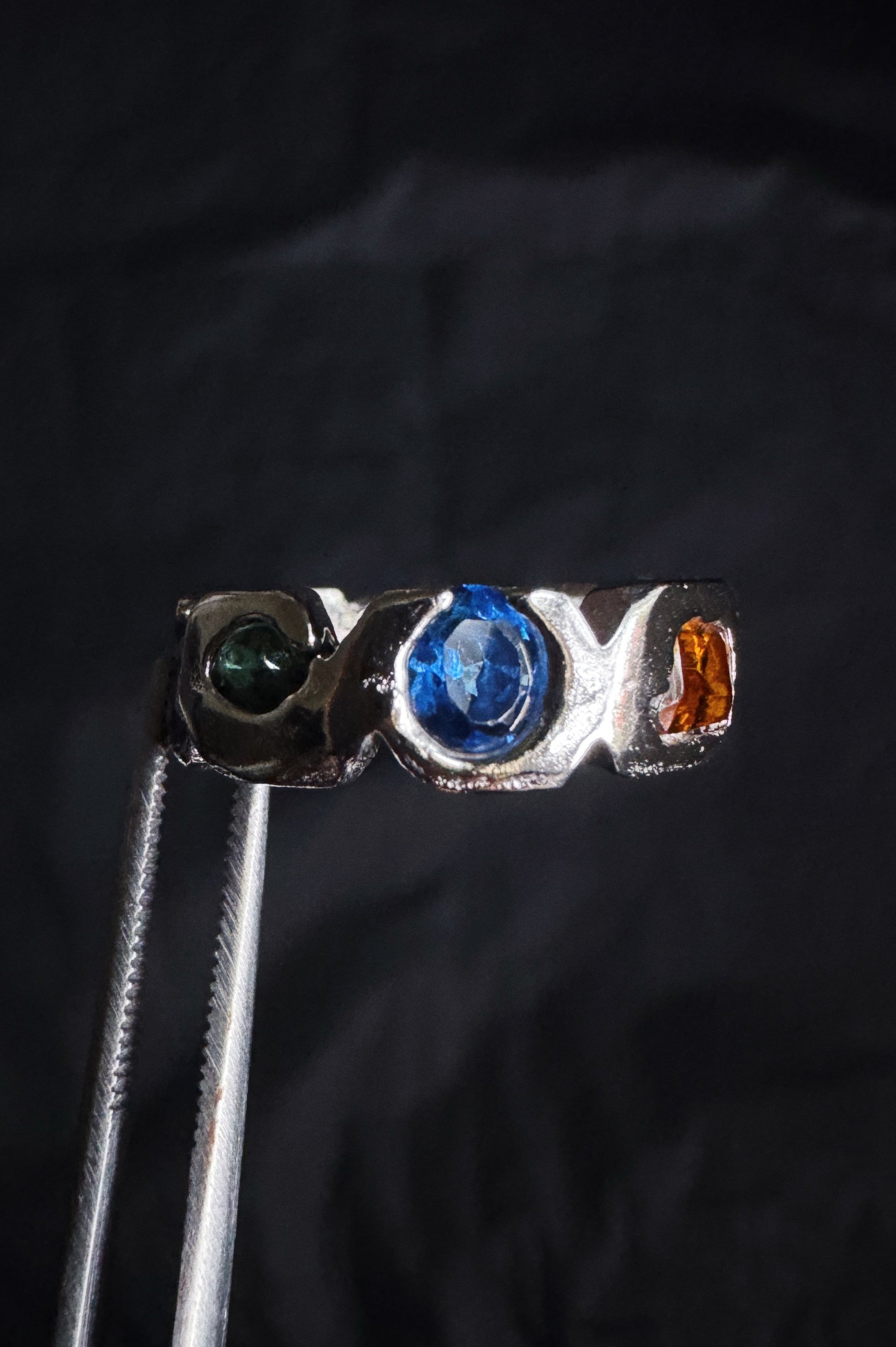 molten silver is poured into a sand mold, the stones are placed before pouring the metal allowing them to move around in the liquid silver before it hardens again. each ring is completely unique and unable to be replicated, this is why each piece looks slightly different :-)